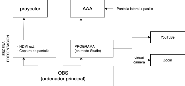 Hay que comprobar que OBS tenga cargado el perfil (configuración general y de emisión) y las escenas adecuadas (UCV). El url del streaming hay que configurarlo y añadirlo a la web de UCV de manera videoconferencia, está programada semanalmente para que el enlace sea el mismo. Existe un enlace corto de la videoconferencia que es https://ucv.cat/zoom